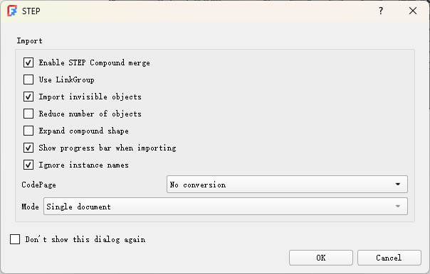 | Import invisible objects | ✅ 勾选 | 导入STEP文件中标记为”隐藏”的对象:优点是能够保留完整设计意图、 可用于后续建模参考、可手动切换显示等 | 隐藏对象 | 低 |